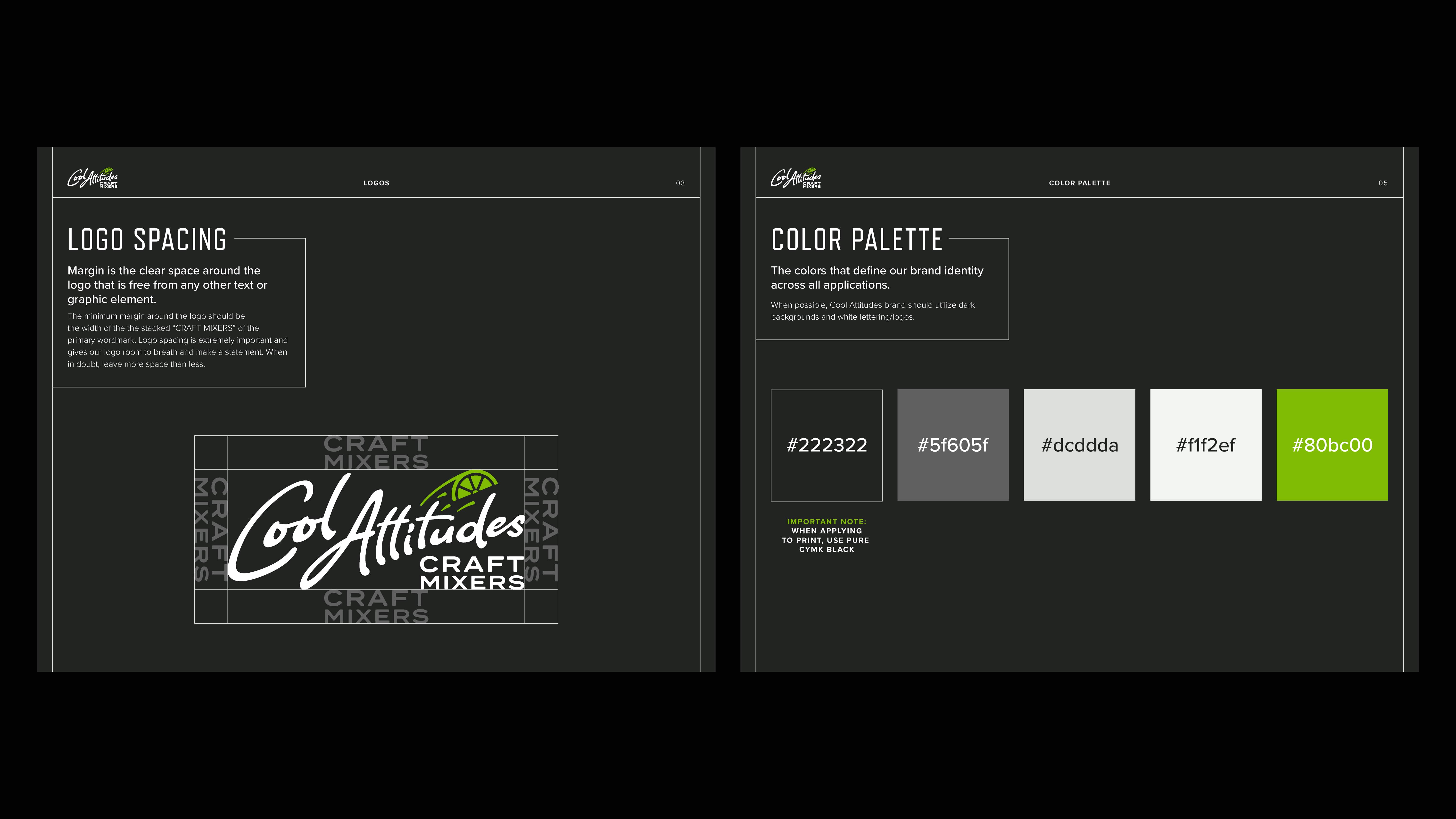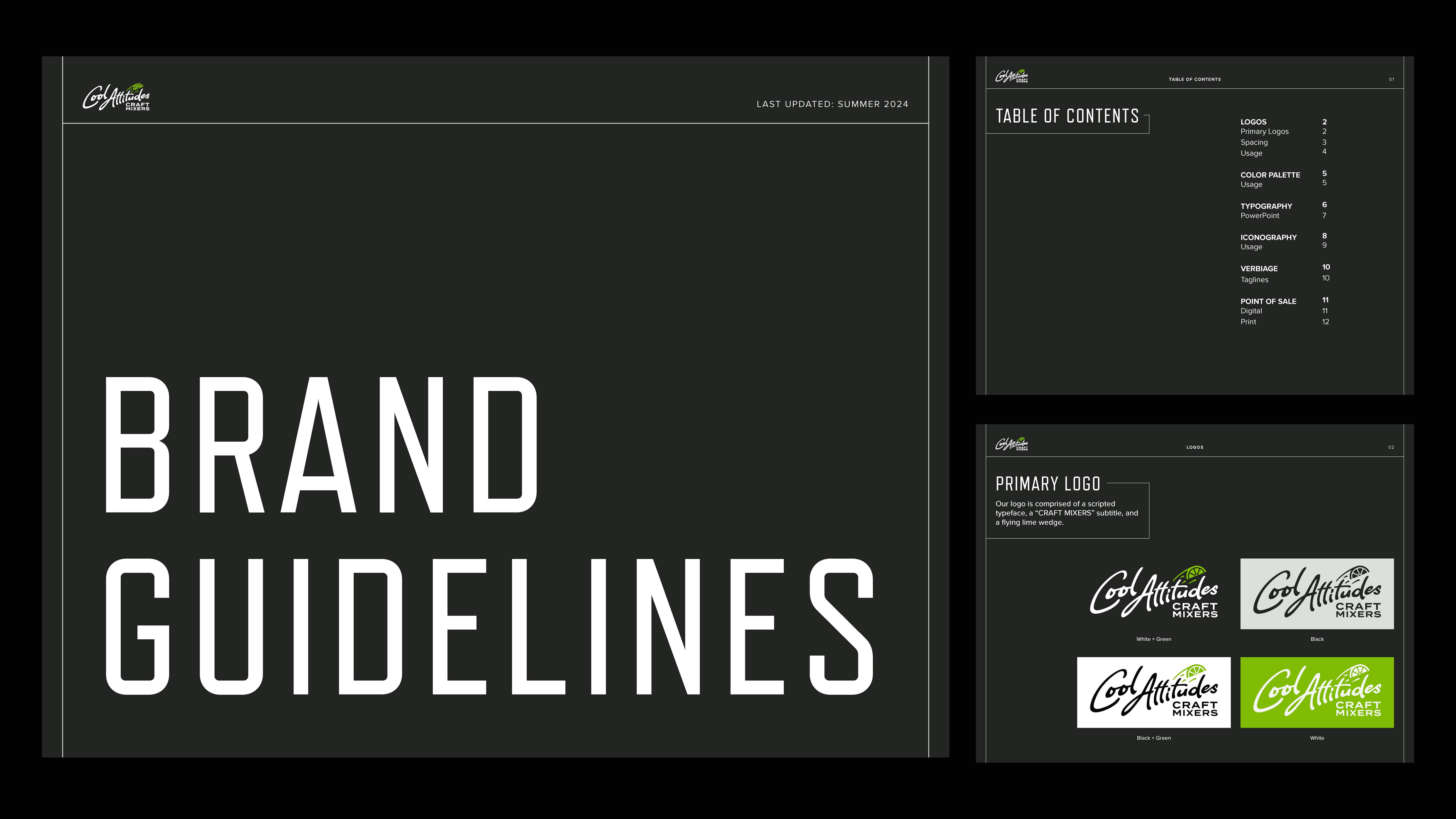 Following a logo redesign, Cool Attitudes needed a comprehensive brand overhaul across all materials that would feel as premium as their cocktail mixers while remaining flexible enough to showcase multiple beverage brand partners.