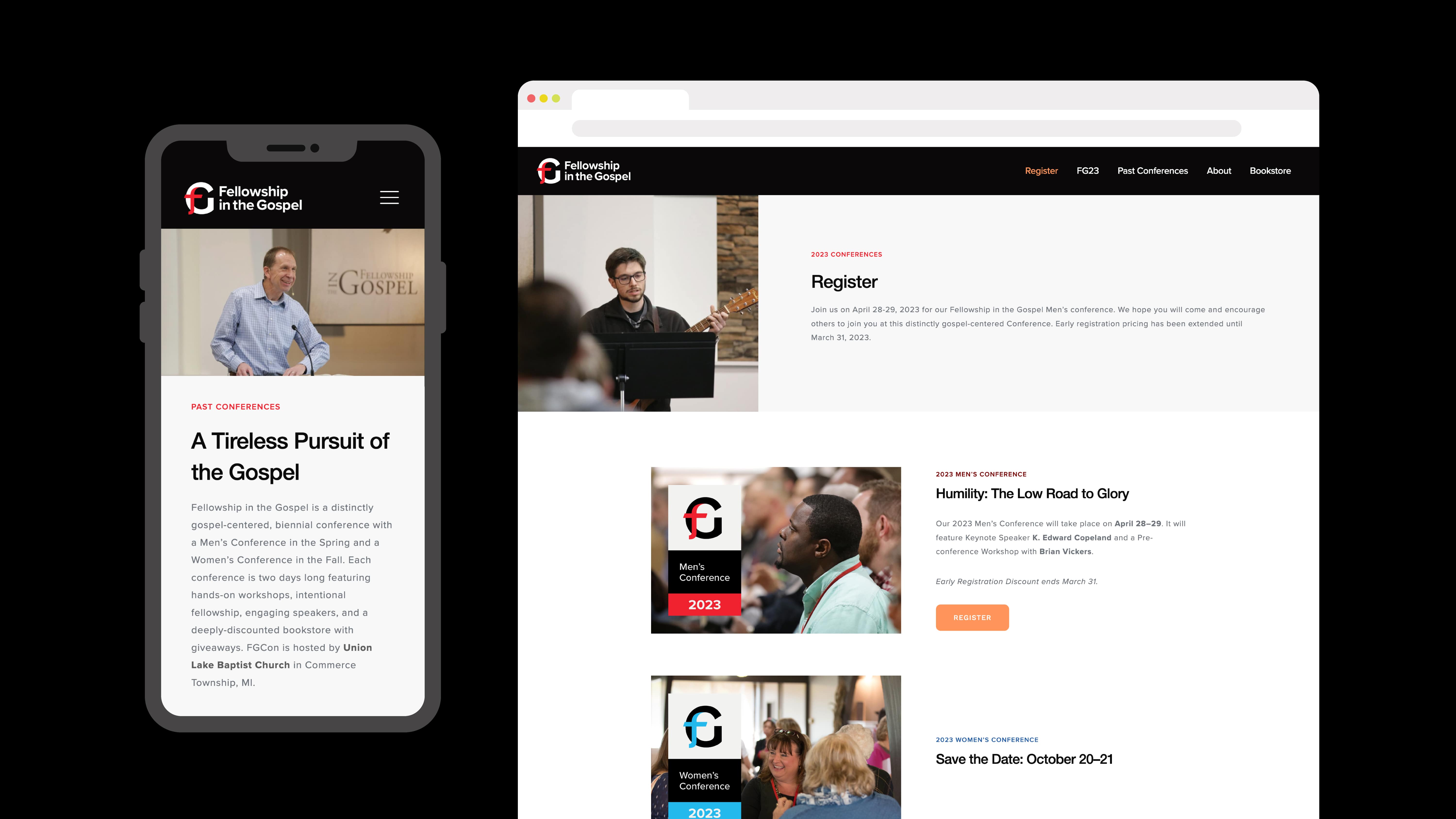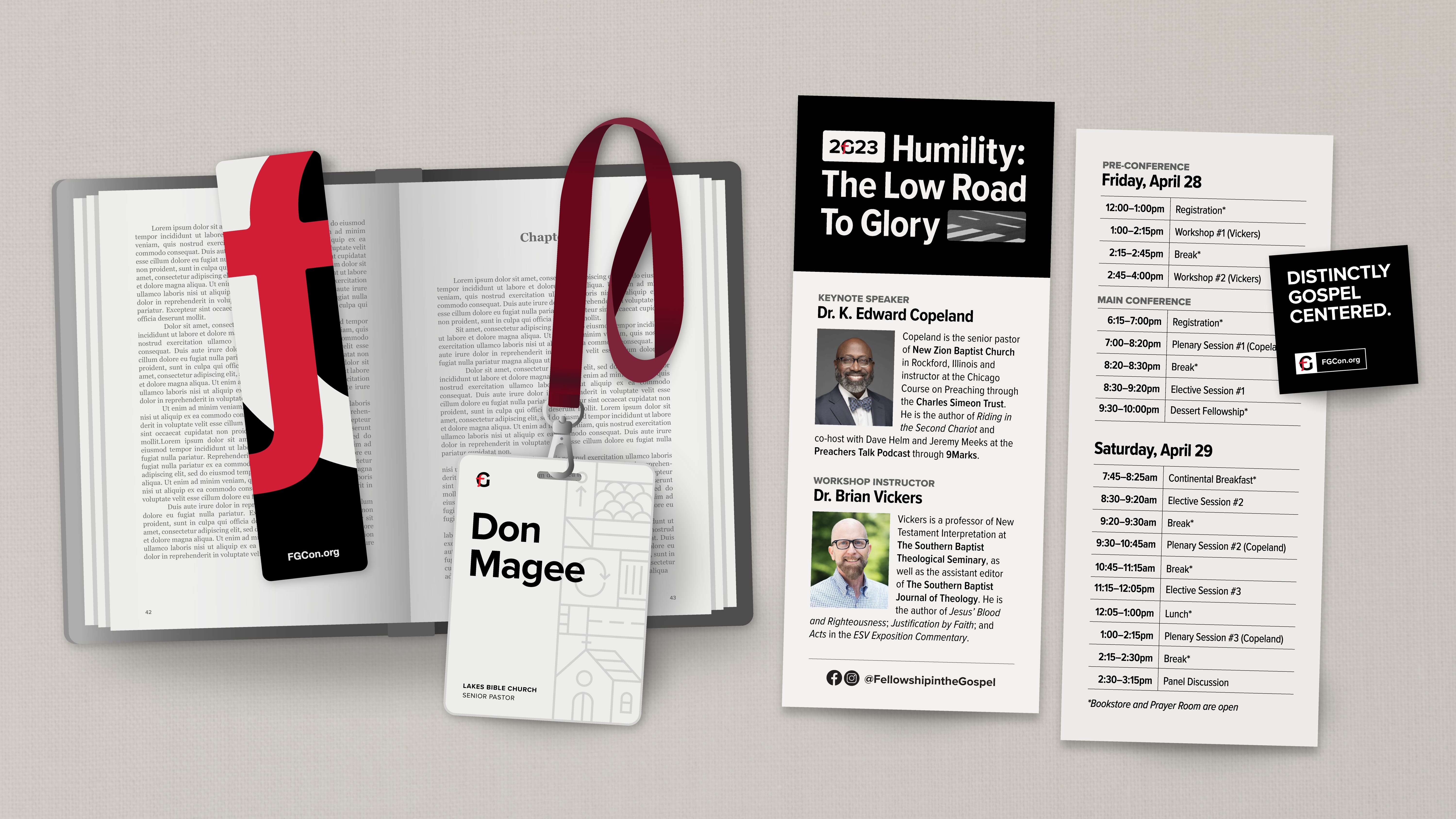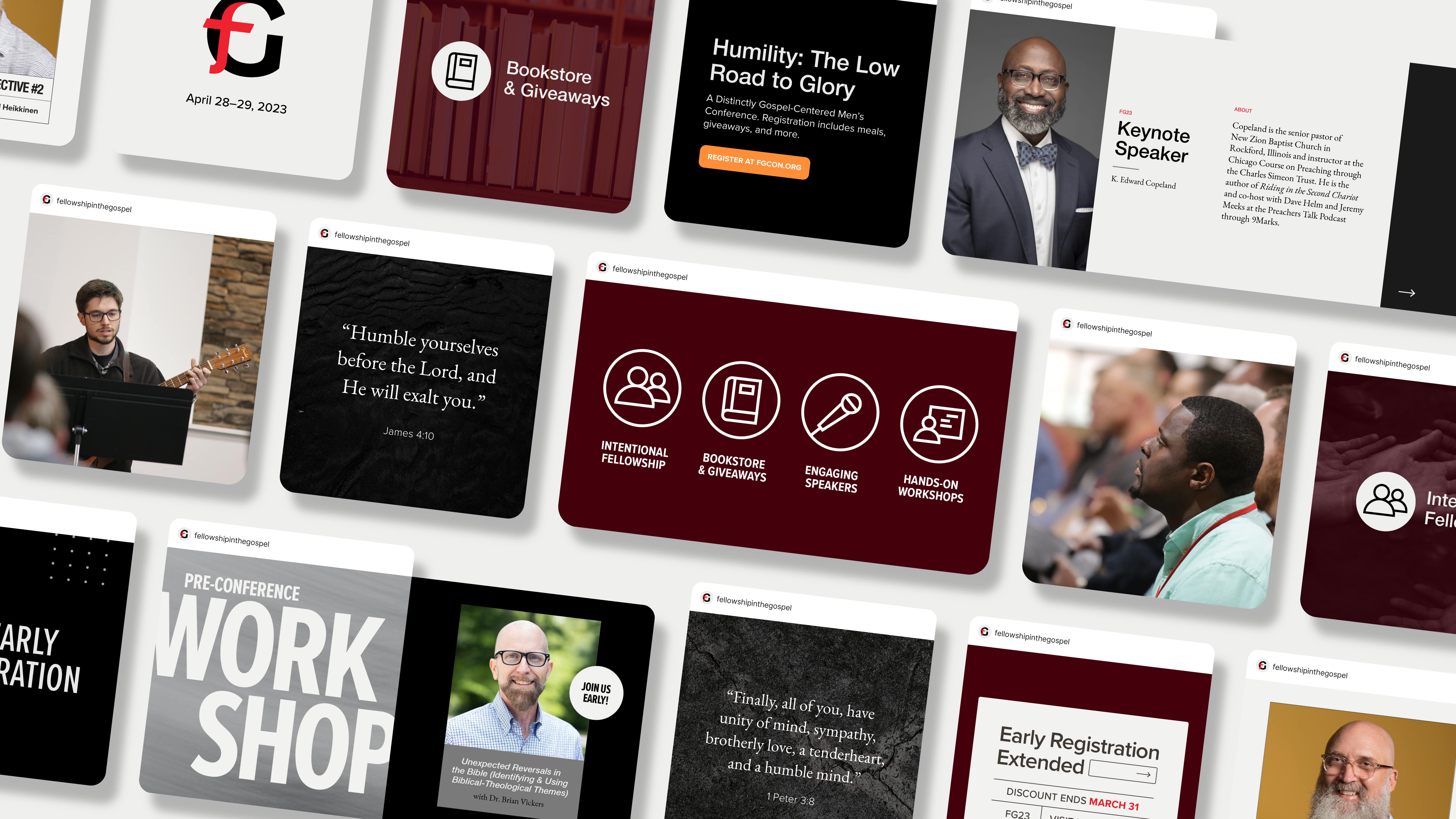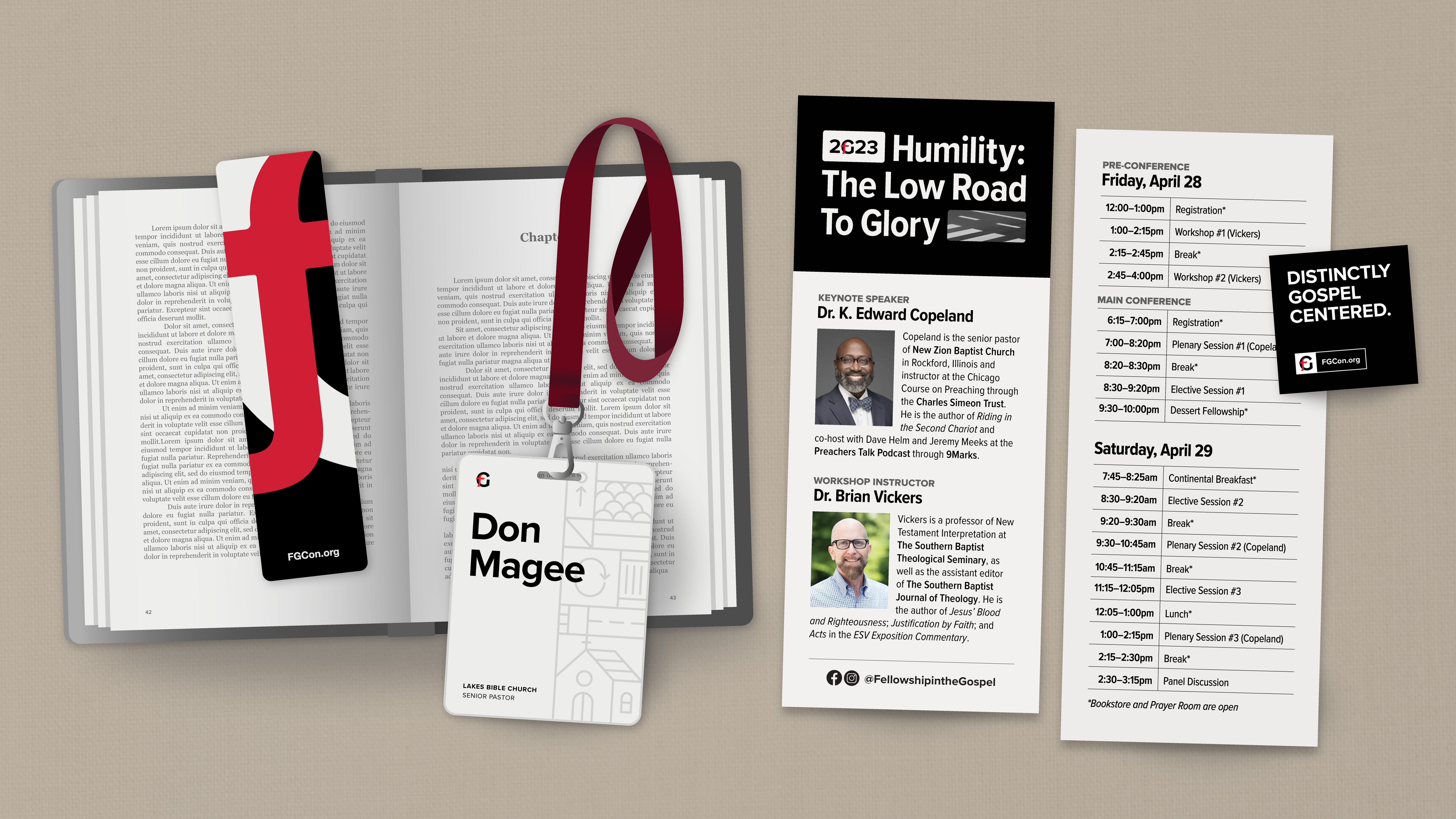 Following a recent brand refresh, the Fellowship in the Gospel Conference needed updated attendee materials, social graphics, website, and signage that would work cohesively with their new brand identity.